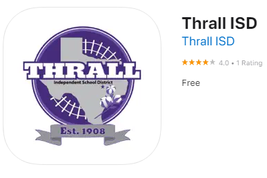 Thrall ISD encourages our students' parents/guardians, extended family members, friends and our community to add the Thrall ISD app to their smart phone/device. It is available in the Apple App Store and also from Google Play. The app sends notifications to your smart phone/device, similar to text messages, and you can filter the notifications you receive by Campus. The app also provides quick and easy access to many of the same features as found on the website--Live Feed, Events, Today's Breakfast and Lunch Menus, Sports Scores, and much more. Parent-teacher communication is now available in the Rooms (classrooms) section of the app, too.